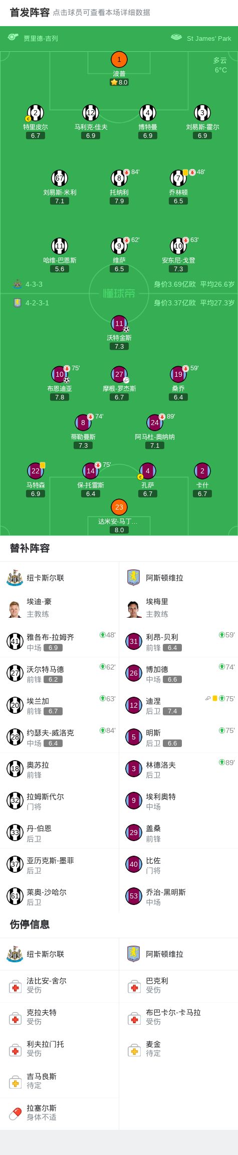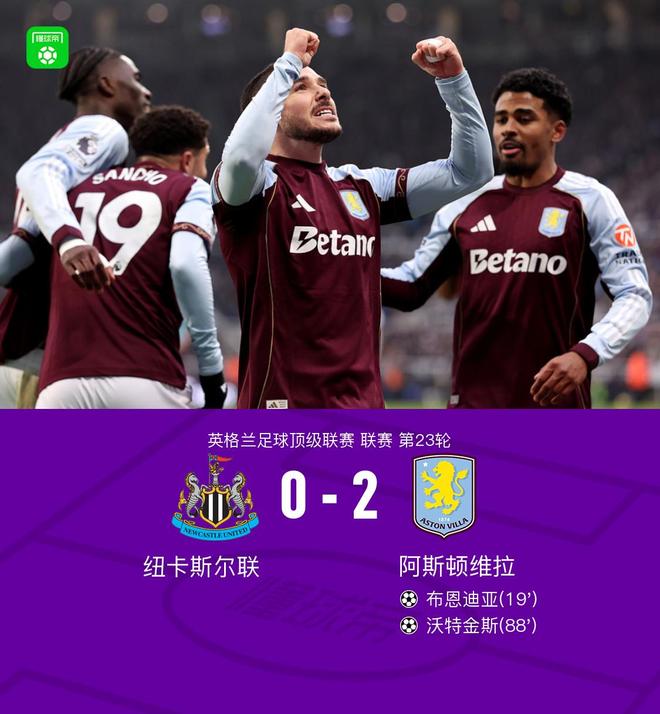 維拉2-0客勝紐卡,布恩迪亞遠(yuǎn)射破門,沃特金斯頭球建功